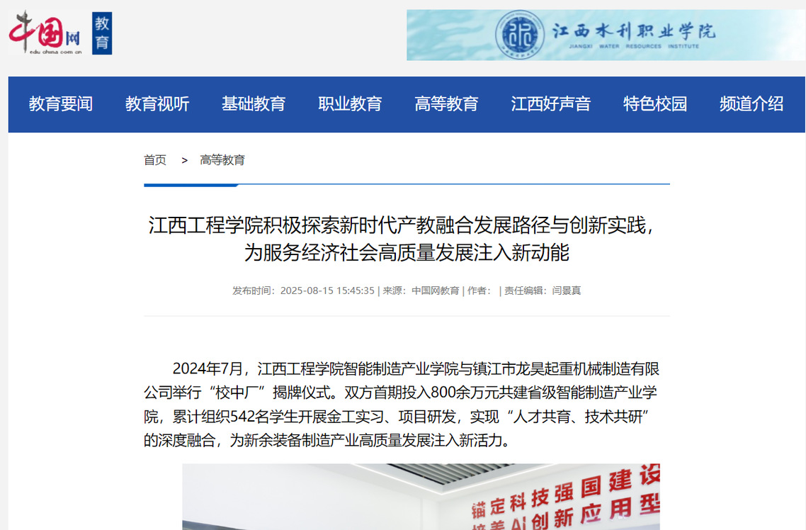 2024年7月,江西工程學(xué)院智能制造產(chǎn)業(yè)學(xué)院與鎮(zhèn)江市龍昊起重機(jī)械制造有限公司舉行“校中廠”揭牌儀式。雙方首期投入800余萬元共建省級(jí)智能制造產(chǎn)業(yè)學(xué)院,累計(jì)組織542名學(xué)生開展金工實(shí)習(xí)、項(xiàng)目研發(fā),實(shí)現(xiàn)“人才共育、技術(shù)共研”的深度融合,為新余裝備制造產(chǎn)業(yè)高質(zhì)量發(fā)展注入新活力。