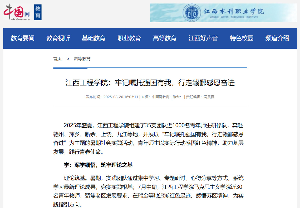 2025年盛夏,江西工程學(xué)院組建了35支團(tuán)隊近1000名青年師生研修隊,奔赴贛州、萍鄉(xiāng)、新余、上饒、九江等地,開展以“牢記囑托強(qiáng)國有我,行走贛鄱感恩奮進(jìn)”為主題的暑期社會實踐活動。青年師生以實際行動感悟紅色精神,助力基層發(fā)展,踐行青春使命。