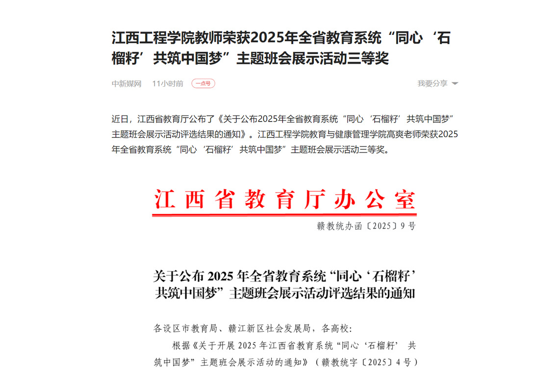 近日,江西省教育廳公布了《關(guān)于公布2025年全省教育系統(tǒng)“同心‘石榴籽’共筑中國夢”主題班會展示活動評選結(jié)果的通知》。江西工程學(xué)院教育與健康管理學(xué)院高爽老師榮獲2025年全省教育系統(tǒng)“同心‘石榴籽’共筑中國夢”主題班會展示活動三等獎。