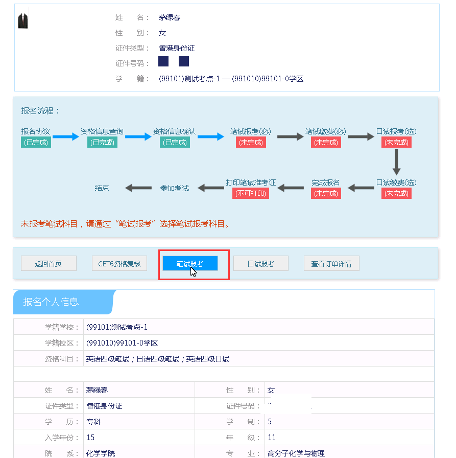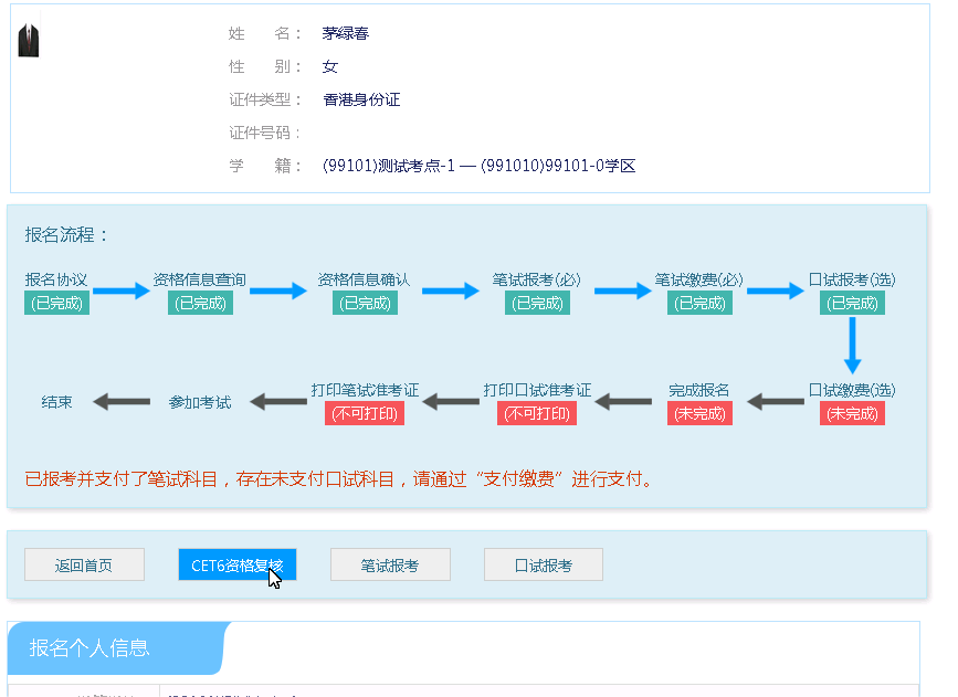 考生可以在這個頁面,檢查自己的照片和基本信息是否正確,查看自己的報(bào)考資格科目和進(jìn)行CET6資格復(fù)核申請。