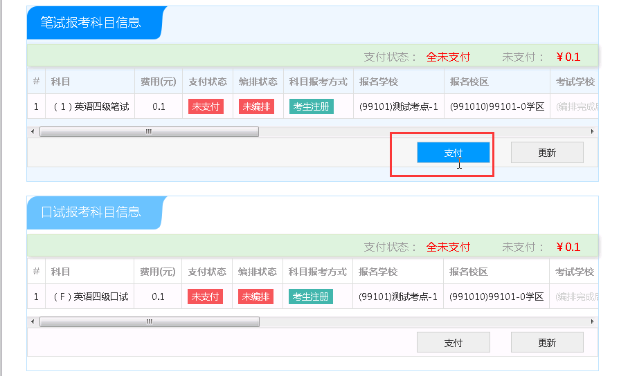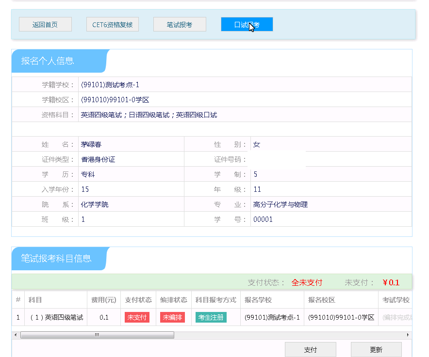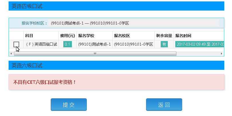 選擇要報(bào)考的科目,點(diǎn)擊“提交”按鈕,返回到考生報(bào)名頁面,點(diǎn)擊“口試報(bào)考”