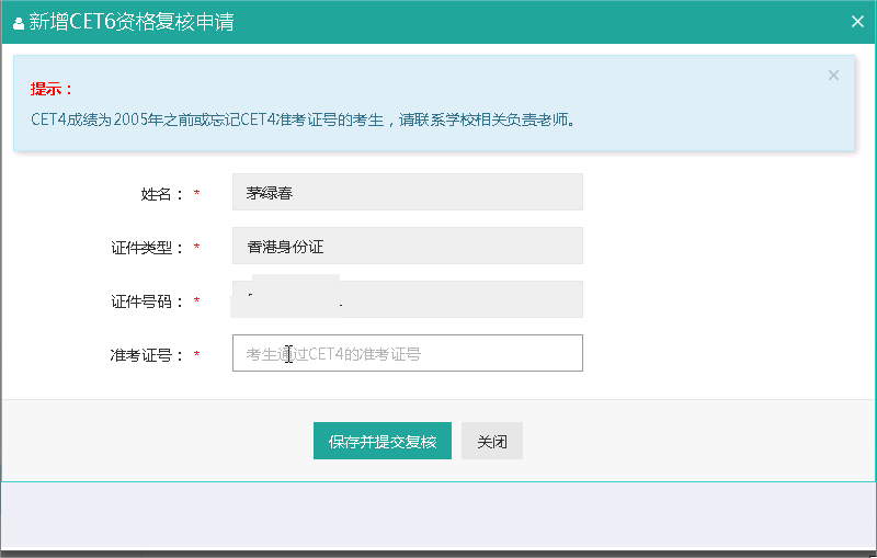 填寫考生的四級準(zhǔn)考證號,如果準(zhǔn)考證號正確,那么姓名和證件號碼任意一項(xiàng)正確就可以自動審核通過。