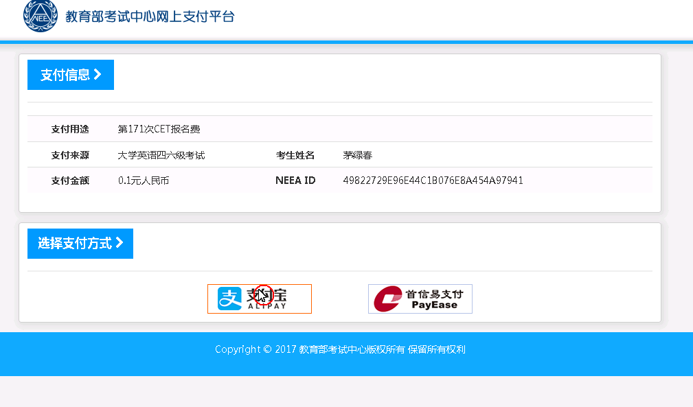 進(jìn)入支付信息頁面,可以選擇支付寶支付,也可以選擇首信易支付兩種支付方式