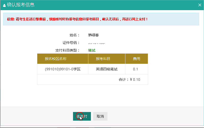 彈出確認(rèn)支付信息界面,點(diǎn)擊“去支付”按鈕