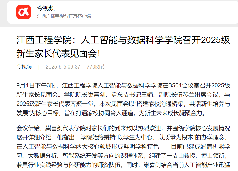 此次2025級新生家長代表見面會的成功召開,不僅搭建起家校之間高效溝通的橋梁,更凝聚了雙方共同培育新生的共識與力量。未來,人工智能與數(shù)據(jù)科學(xué)學(xué)院將持續(xù)完善家校協(xié)同育人機(jī)制,通過定期舉辦家長開放日、發(fā)布學(xué)生成長動態(tài)報告、開展家校線上交流會等形式,進(jìn)一步深化家校合作,攜手家長為新生的成長成才保駕護(hù)航,助力每一位新生在大學(xué)階段實(shí)現(xiàn)全面發(fā)展,成長為符合時代需求的人工智能與數(shù)據(jù)科學(xué)領(lǐng)域?qū)I(yè)人才。