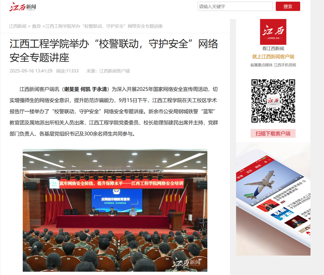 江西新聞客戶端訊(謝旻旻 何凱 于永清)為深入開展2025年國(guó)家網(wǎng)絡(luò)安全宣傳周活動(dòng),切實(shí)增強(qiáng)師生的網(wǎng)絡(luò)安全意識(shí),提升防范詐騙能力,9月15日下午,江西工程學(xué)院在天工校區(qū)學(xué)術(shù)報(bào)告廳一樓舉辦了“校警聯(lián)動(dòng),守護(hù)安全”網(wǎng)絡(luò)安全專題講座。新余市公安局鋼城鐵警“藍(lán)軍”教官團(tuán)及屬地派出所相關(guān)人員出席,江西工程學(xué)院黨委委員、校長(zhǎng)助理鄒建民出席并主持,黨群部門負(fù)責(zé)人、各基層黨組織書記及300余名師生共同參與。
