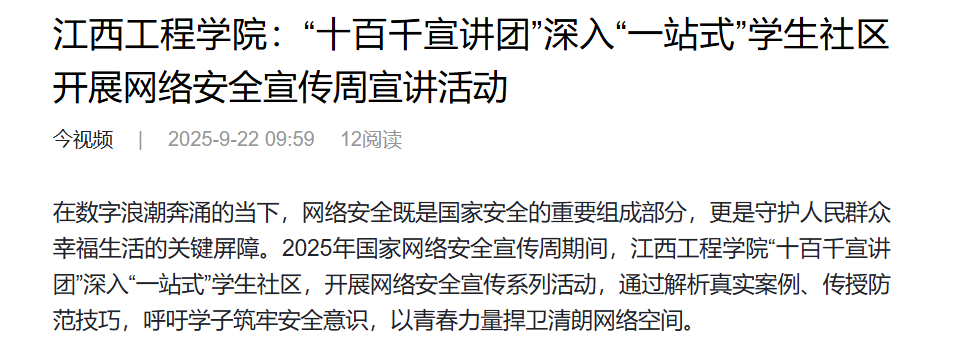 在數(shù)字浪潮奔涌的當下,網(wǎng)絡安全既是國家安全的重要組成部分,更是守護人民群眾幸福生活的關(guān)鍵屏障。2025年國家網(wǎng)絡安全宣傳周期間,江西工程學院“十百千宣講團”深入“一站式”學生社區(qū),開展網(wǎng)絡安全宣傳系列活動,通過解析真實案例、傳授防范技巧,呼吁學子筑牢安全意識,以青春力量捍衛(wèi)清朗網(wǎng)絡空間。