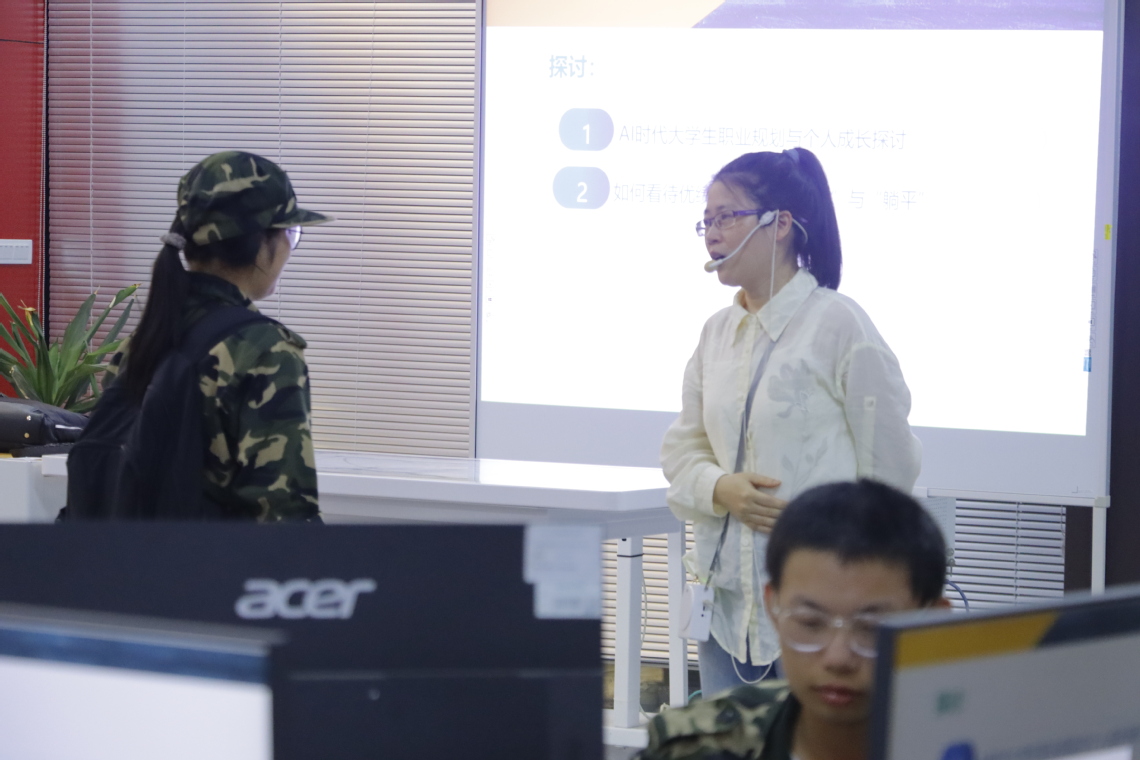 講座緊扣當(dāng)下時(shí)代熱點(diǎn),圍繞“AI時(shí)代大學(xué)生職業(yè)規(guī)劃與個(gè)人成長(zhǎng)探討”“如何看待優(yōu)績(jī)主義下的‘內(nèi)卷’與‘躺平’”兩大核心主題展開(kāi)。在“AI時(shí)代大學(xué)生職業(yè)規(guī)劃與個(gè)人成長(zhǎng)探討”環(huán)節(jié),黃琴深入剖析AI技術(shù)對(duì)就業(yè)市場(chǎng)的變革影響,明確指出:大學(xué)生既要筑牢專業(yè)技能根基,更需錘煉跨學(xué)科整合能力、批判性思維、創(chuàng)新能力及倫理判斷等綜合素質(zhì),方能適應(yīng)瞬息萬(wàn)變的職場(chǎng)環(huán)境。