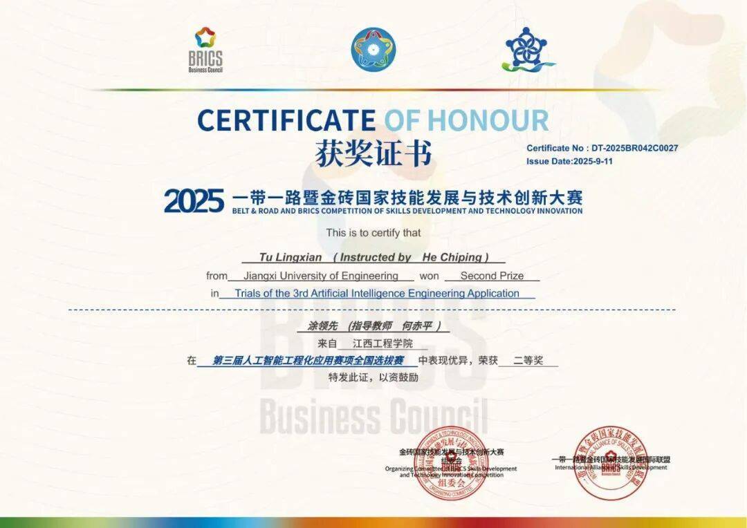 近日,2025“一帶一路”暨金磚國家技能發(fā)展與技術(shù)創(chuàng)新大賽——第三屆人工智能工程化應用賽項(工程實踐)全國選拔賽中,我校人工智能與數(shù)據(jù)科學學院派出的兩支隊伍全員獲獎,分別榮獲二等獎和三等獎,充分展現(xiàn)了學校在AI工程化人才方面的培養(yǎng)成效。