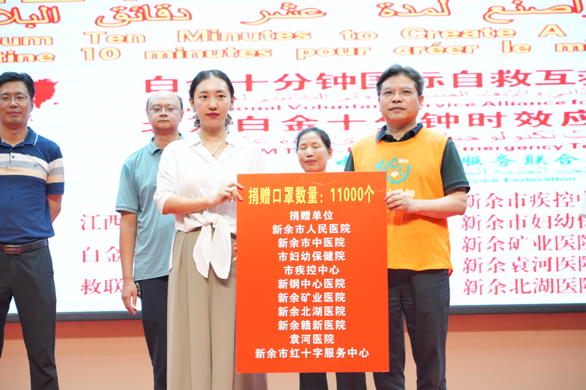 在熱烈的掌聲中,新余市衛(wèi)健委醫(yī)政科科長劉鵬發(fā)表講話并宣布:“健康新余行動暨第十六屆‘急救白金十分鐘——全國(國際)自救互救日’志愿服務(wù)活動正式開始!”儀式還包括了由新余市人民醫(yī)院向我校進(jìn)行的口罩捐贈,以及為部分留學(xué)生代表頒發(fā)志愿服務(wù)證書、為2025年度“白金十分鐘”優(yōu)秀集體與個人頒獎等環(huán)節(jié)。我校學(xué)生與市人民醫(yī)院共同準(zhǔn)備的舞蹈節(jié)目《白金十分鐘》為活動增添了活力與溫情。
