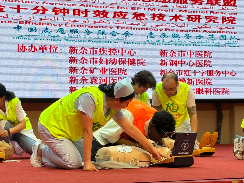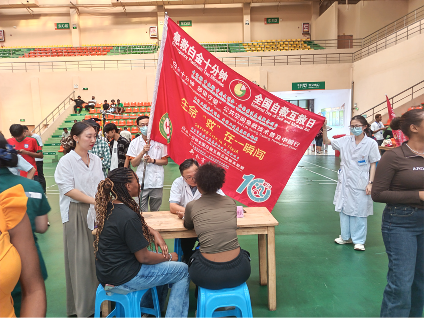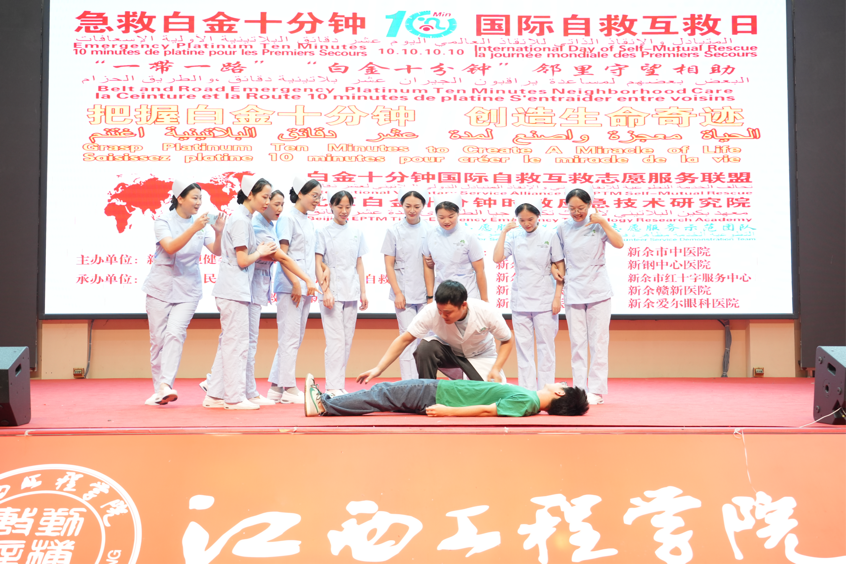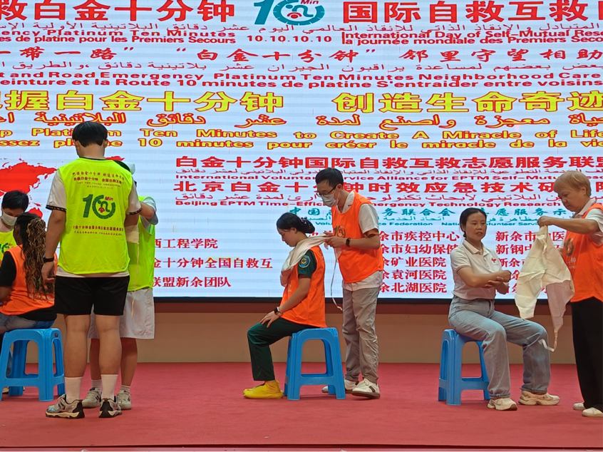 活動的第二大部分“健康新余暨白金十分鐘科普活動” 將現(xiàn)場氣氛推向高潮。在專業(yè)醫(yī)護(hù)人員的主導(dǎo)下,現(xiàn)場分別設(shè)置了成人心肺復(fù)蘇和AED使用、解除氣管異物梗阻(海姆立克急救法)、大懸臂帶包扎等多個實(shí)操演示與體驗(yàn)區(qū)。來自新余市人民醫(yī)院、中醫(yī)院、紅十字服務(wù)中心等單位的醫(yī)護(hù)人員同臺演示,步驟清晰,講解專業(yè)。演示結(jié)束后,我校留學(xué)生們被特邀上臺,在專家的一對一指導(dǎo)下進(jìn)行實(shí)踐操作,親身學(xué)習(xí)掌握了多項(xiàng)關(guān)鍵的急救技術(shù)?;顒蝇F(xiàn)場還同步開展了專家義診和面向所有參與者的臺下技術(shù)傳授,形成了“人人學(xué)急救”的生動場面。