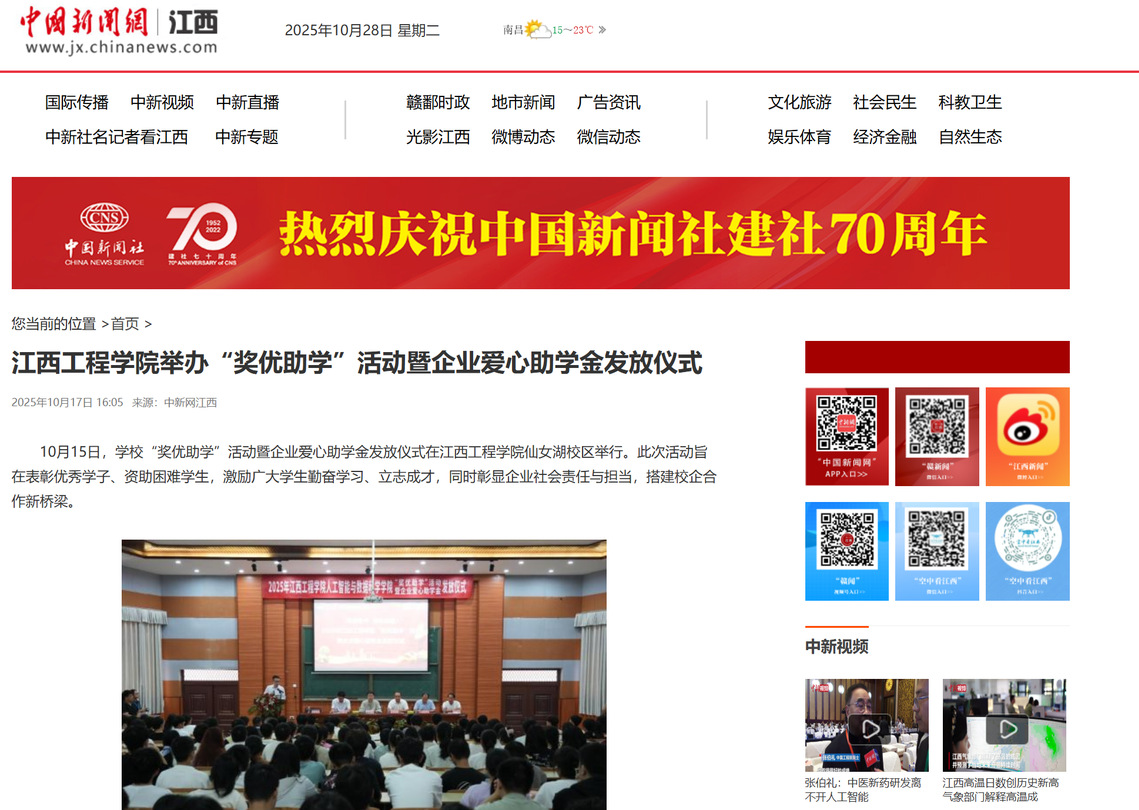 10月15日,學?!蔼剝?yōu)助學”活動暨企業(yè)愛心助學金發(fā)放儀式在江西工程學院仙女湖校區(qū)舉行。此次活動旨在表彰優(yōu)秀學子、資助困難學生,激勵廣大學生勤奮學習、立志成才,同時彰顯企業(yè)社會責任與擔當,搭建校企合作新橋梁。