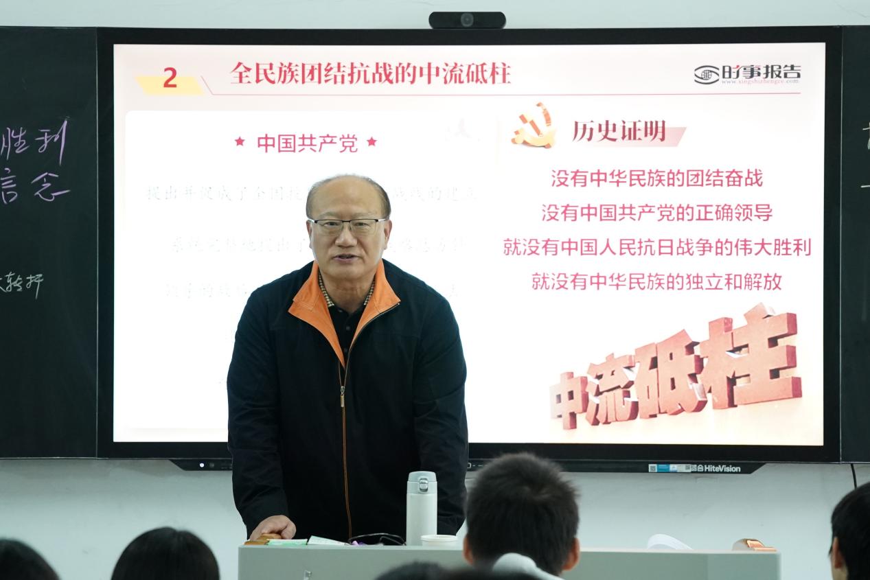 劉新躍以紀(jì)念中國(guó)人民抗日戰(zhàn)爭(zhēng)暨世界反法西斯戰(zhàn)爭(zhēng)勝利80周年大會(huì)為切入點(diǎn),帶領(lǐng)同學(xué)們回顧了波瀾壯闊、艱苦卓絕的十四年抗戰(zhàn)歲月,深刻指出中國(guó)共產(chǎn)黨是全民族團(tuán)結(jié)抗戰(zhàn)的中流砥柱。他強(qiáng)調(diào),抗日戰(zhàn)爭(zhēng)的偉大勝利不僅洗刷了近代以來(lái)的民族恥辱、重鑄了中國(guó)的大國(guó)地位、開(kāi)辟了民族復(fù)興的光明前景,更在血與火的考驗(yàn)中鑄就了偉大的抗戰(zhàn)精神。“這一寶貴的精神財(cái)富,是激勵(lì)我們克服一切艱難險(xiǎn)阻、向著偉大復(fù)興目標(biāo)奮勇前行的強(qiáng)大動(dòng)力。”劉新躍寄語(yǔ)青年學(xué)子,作為民族復(fù)興主力軍,要在學(xué)習(xí)中錘煉本領(lǐng),在實(shí)踐中堅(jiān)定信念,讓抗戰(zhàn)精神成為奮進(jìn)路上的不竭動(dòng)力。