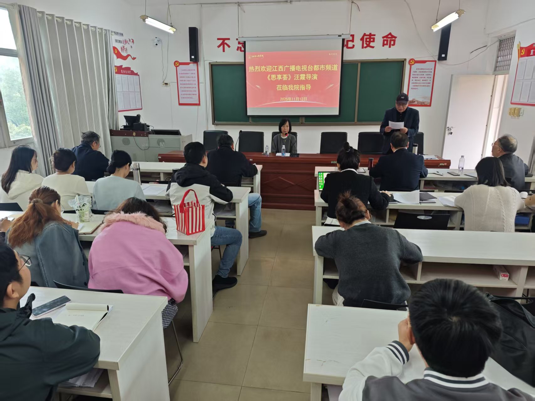 2025年11月12日,一場聚焦“思政欄目的選題邏輯與內容建構技巧”的專題講座,在江西工程學院馬克思主義學院A201會議室精彩開講。本次講座特邀江西廣播電視臺都市頻道《思享薈》導演汪霞蒞臨主講,由馬克思主義學院院長王勇教授主持,學院近30名教師全程參與,為學?!按笏颊n”建設注入了鮮活的行業(yè)智慧。