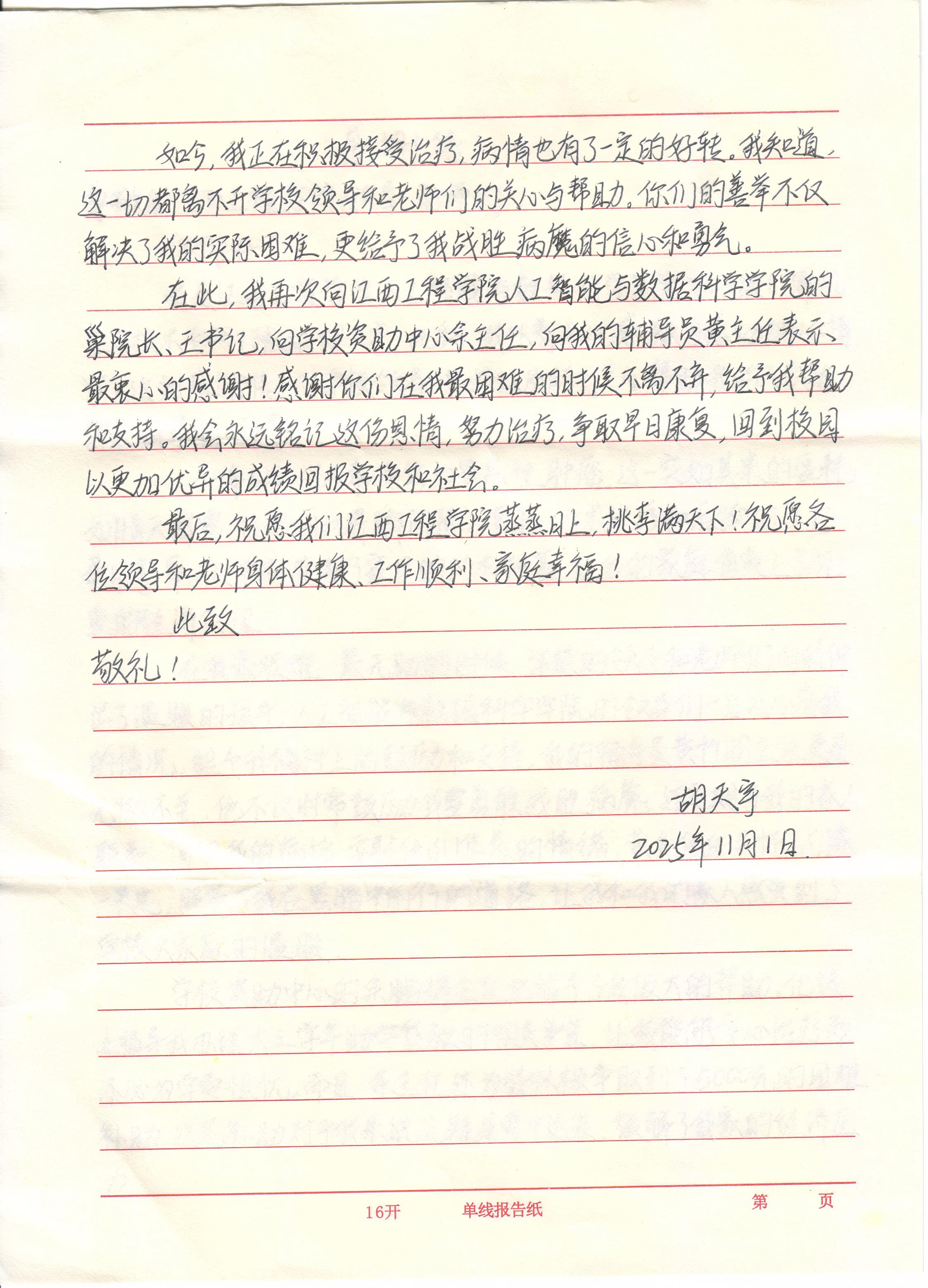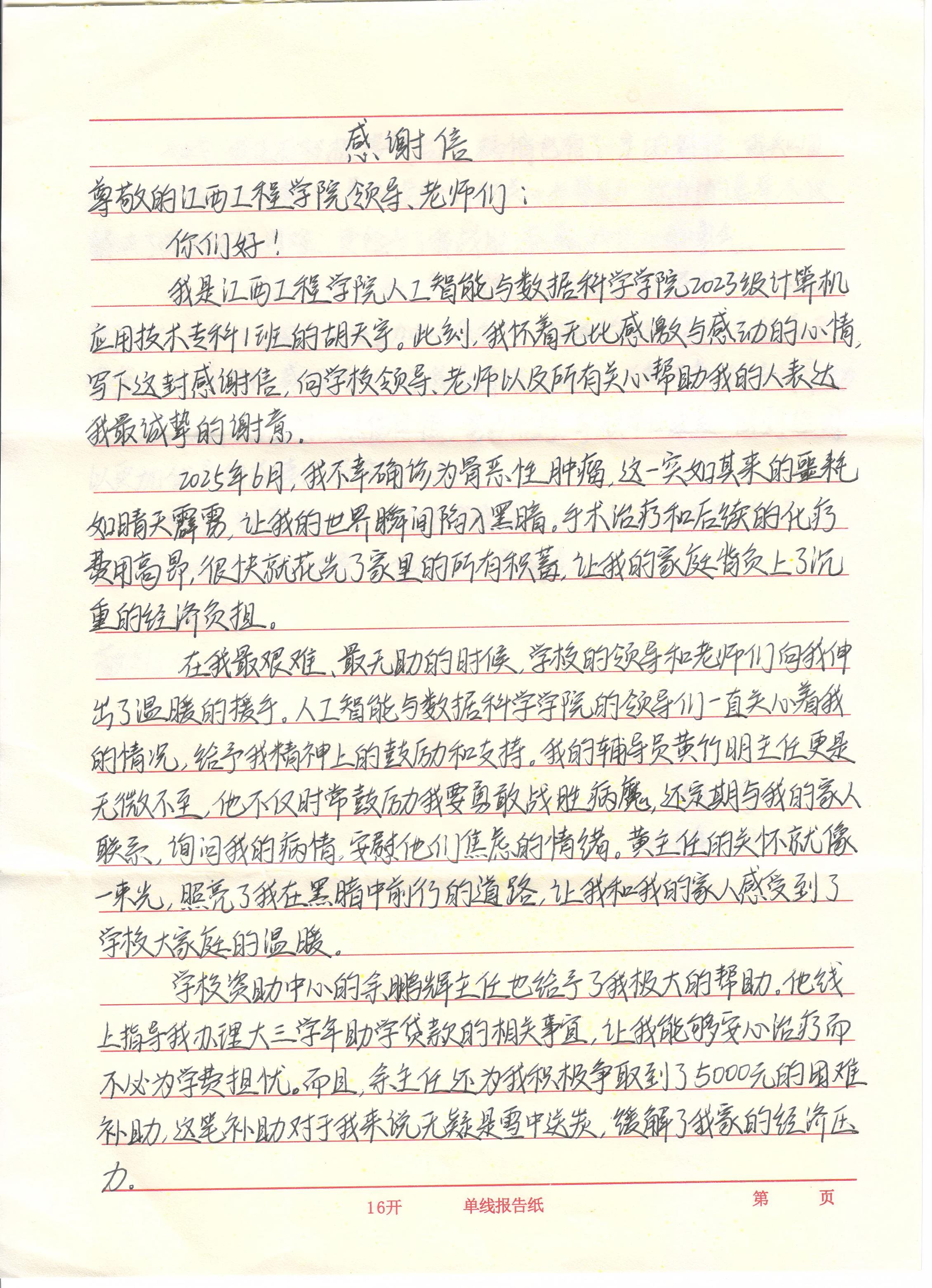 我是江西工程學(xué)院人工智能與數(shù)據(jù)科學(xué)學(xué)院2023級(jí)計(jì)算機(jī)應(yīng)用技術(shù)???/span>1班的胡天宇。此刻,我懷著無(wú)比感激與感動(dòng)的心情,寫下這封感謝信,向?qū)W校領(lǐng)導(dǎo)、老師以及所有關(guān)心幫助我的人表達(dá)我最誠(chéng)摯的謝意。