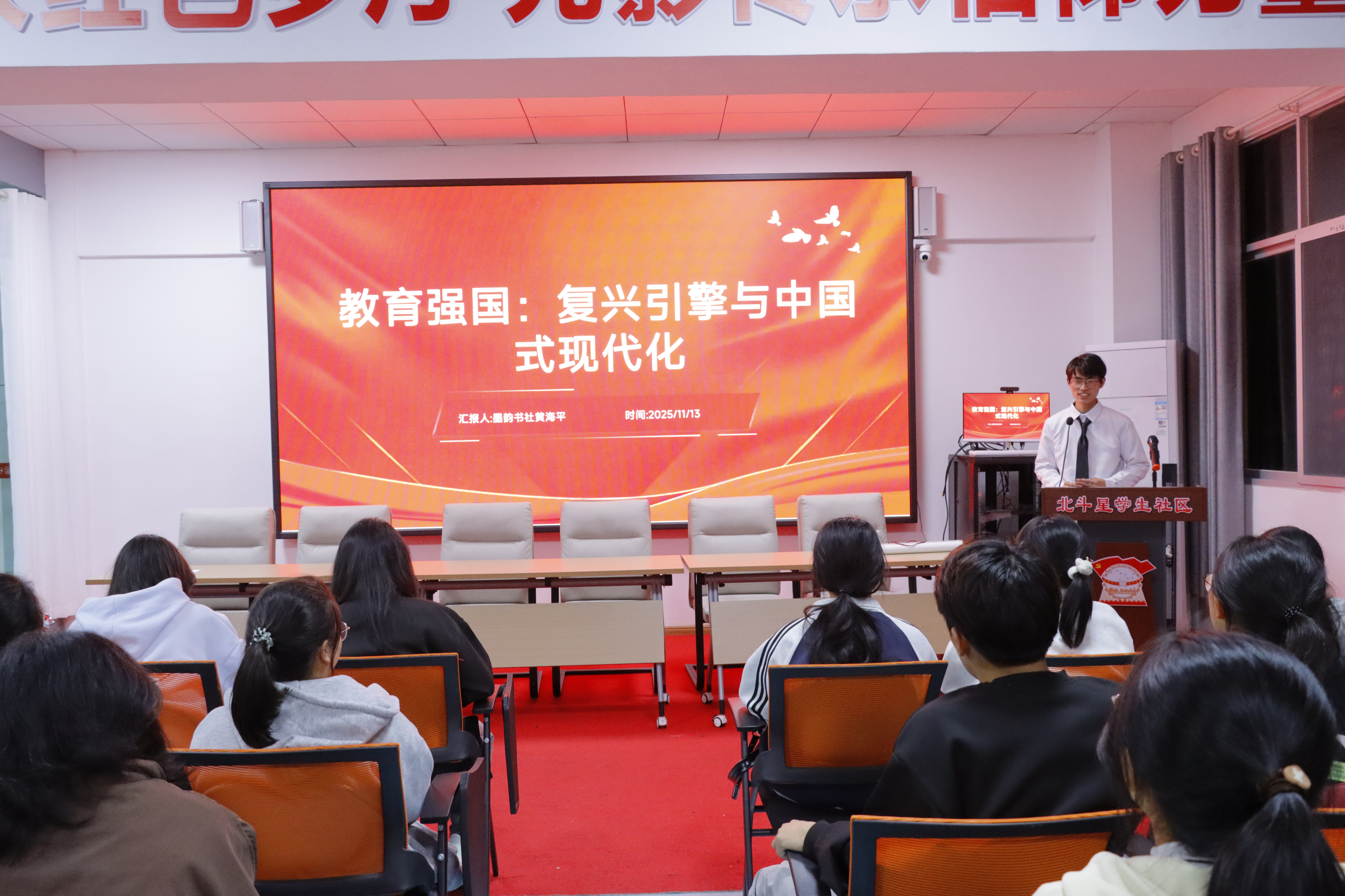 以“接地氣”賦能,讓理論宣講有“土味”更見“實效”。學(xué)?!笆偾А毙v團成員、墨韻書社社長黃海平在宣講中表示,學(xué)生社團將深入學(xué)習(xí)貫徹黨的二十屆四中全會精神,以實際行動弘揚和踐行社會主義核心價值觀,深耕校園文化建設(shè),提升“文化興?!眰鞑チεc影響力,為學(xué)校文化建設(shè)貢獻青春力量。