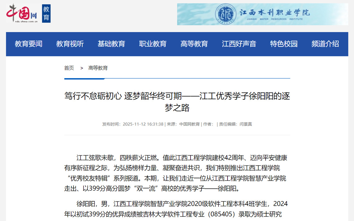 江工弦歌未歇,四秩薪火正燃。值此江西工程學(xué)院建校42周年、邁向平安健康有序新征程之際,為弘揚(yáng)榜樣力量、凝聚奮進(jìn)共識,我們特別推出江西工程學(xué)院“優(yōu)秀校友特輯”系列報道。本期,讓我們走近一位從江西工程學(xué)院智慧產(chǎn)業(yè)學(xué)院走出、以399分高分圓夢“雙一流”高校的優(yōu)秀學(xué)子——徐陽陽。