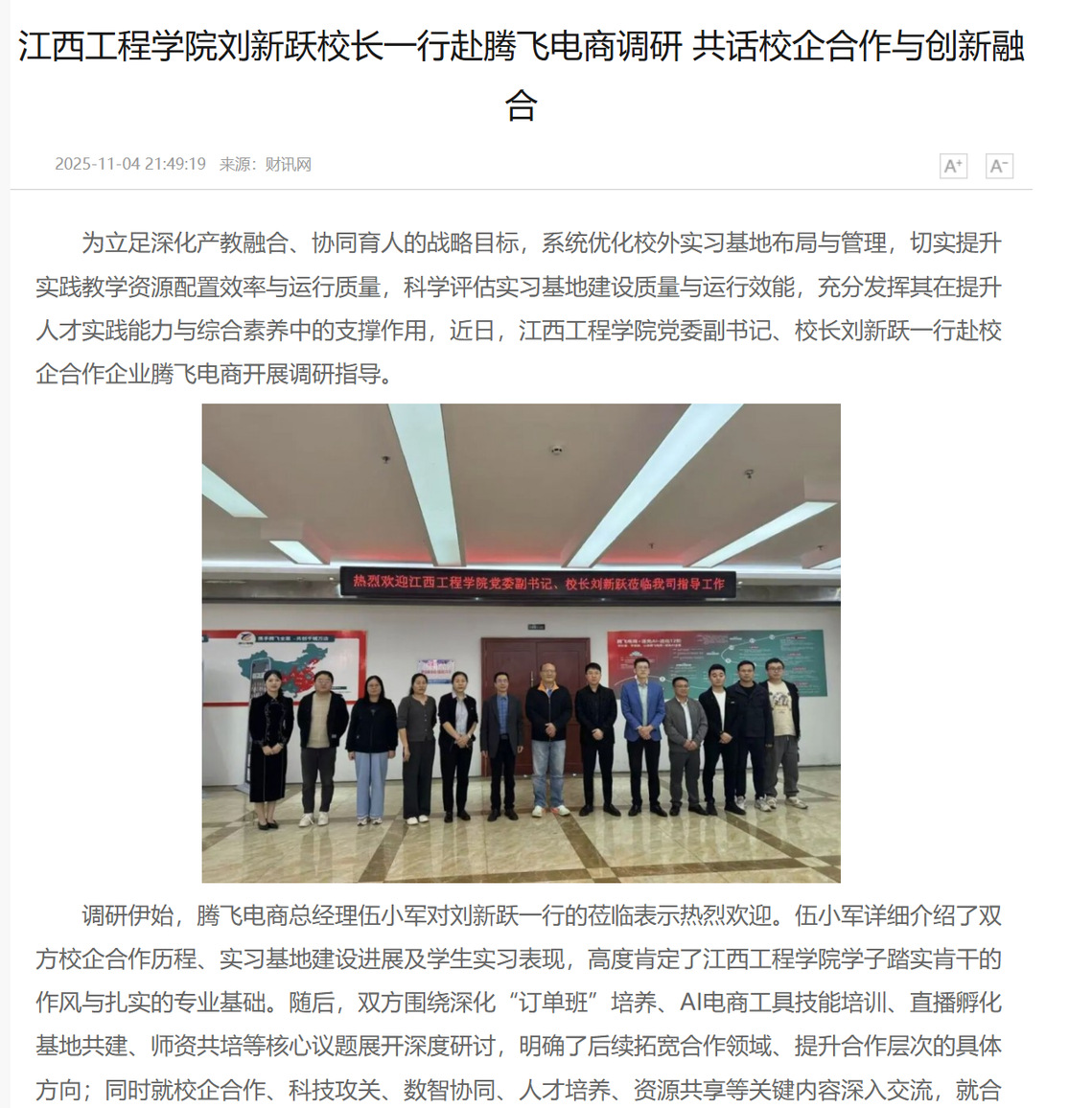 調(diào)研伊始,騰飛電商總經(jīng)理伍小軍對劉新躍一行的蒞臨表示熱烈歡迎。伍小軍詳細介紹了雙方校企合作歷程、實習(xí)基地建設(shè)進展及學(xué)生實習(xí)表現(xiàn),高度肯定了江西工程學(xué)院學(xué)子踏實肯干的作風(fēng)與扎實的專業(yè)基礎(chǔ)。隨后,雙方圍繞深化“訂單班”培養(yǎng)、AI電商工具技能培訓(xùn)、直播孵化基地共建、師資共培等核心議題展開深度研討,明確了后續(xù)拓寬合作領(lǐng)域、提升合作層次的具體方向;同時就校企合作、科技攻關(guān)、數(shù)智協(xié)同、人才培養(yǎng)、資源共享等關(guān)鍵內(nèi)容深入交流,就合作中的具體問題交換意見,最終在產(chǎn)教融合、科研成果轉(zhuǎn)化、人才交流培養(yǎng)等領(lǐng)域達成深化合作共識。