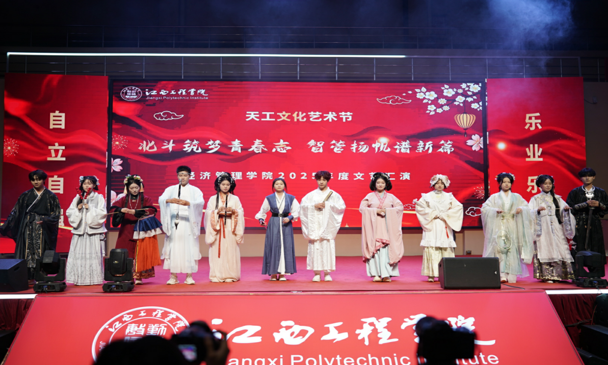 其他學(xué)院亦結(jié)合學(xué)科特色彰顯育人特色。語(yǔ)言與傳播學(xué)院以“北斗星·紅傳”黨建品牌為核心,將紅色基因融入節(jié)目審核,英語(yǔ)話劇《甄嬛傳之滴血驗(yàn)親》實(shí)現(xiàn)經(jīng)典創(chuàng)新演繹;電子信息工程學(xué)院黨政領(lǐng)導(dǎo)班子成員以“北斗精神”為引領(lǐng),寄語(yǔ)學(xué)子深耕專業(yè)領(lǐng)域、矢志科技報(bào)國(guó),學(xué)子們帶來(lái)的原創(chuàng)節(jié)目緊扣學(xué)科特色,生動(dòng)詮釋了“勤樸敏信”的校訓(xùn)精神。抱石藝術(shù)學(xué)院非遺紙藝時(shí)裝秀《鏤空之美》將傳統(tǒng)工藝與現(xiàn)代設(shè)計(jì)融合,話劇《孔雀東南飛》與朗誦《紅色家書(shū)》厚植人文內(nèi)涵;智能制造與建造學(xué)院漢服走秀《國(guó)色霓裳》與武術(shù)表演則彰顯文化自信。系列活動(dòng)不僅豐富了校園文化生活,更將“自立自強(qiáng)、樂(lè)業(yè)樂(lè)群”的校園精神深植學(xué)子心中。