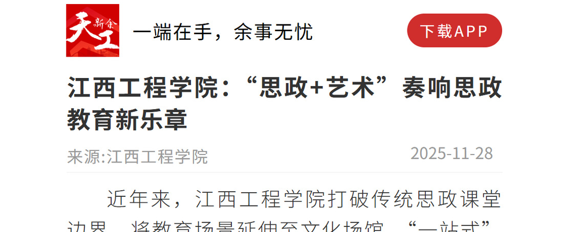 “思政+藝術(shù)”構(gòu)建育人新格局。江西工程學(xué)院通過(guò)天工文化藝術(shù)浸潤(rùn)、勞模精神藝術(shù)化傳播、傳統(tǒng)節(jié)日賦能等多元實(shí)踐,讓“思政+藝術(shù)”融合育人模式落地生根。這種模式打破了思政教育與藝術(shù)教育的壁壘,將價(jià)值引領(lǐng)融入藝術(shù)體驗(yàn),讓學(xué)生在沉浸式、互動(dòng)式參與中,實(shí)現(xiàn)思想覺(jué)悟與藝術(shù)素養(yǎng)的同步提升。新征程新目標(biāo),學(xué)校將繼續(xù)深化“思政+”育人改革,為培養(yǎng)德智體美勞全面發(fā)展的社會(huì)主義建設(shè)者和接班人貢獻(xiàn)學(xué)校力量。