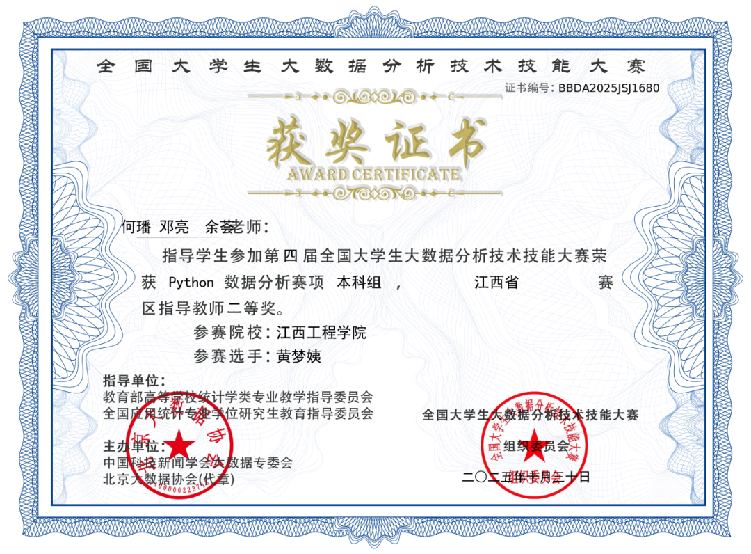 此次獲獎是對學子們努力付出的肯定,更是學校“以賽促學、以賽促教”教育理念的生動體現(xiàn)。下一步,學校將繼續(xù)搭建優(yōu)質(zhì)賽事平臺,鼓勵學生積極參與各類學科競賽,錘煉專業(yè)技能,為培養(yǎng)更多高素質(zhì)應(yīng)用型大數(shù)據(jù)人才蓄力賦能。