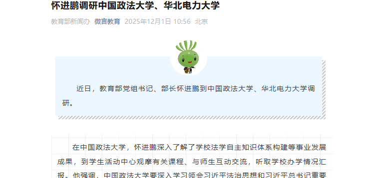 近日,教育部黨組書記、部長懷進鵬到中國政法大學(xué)、華北電力大學(xué)調(diào)研。