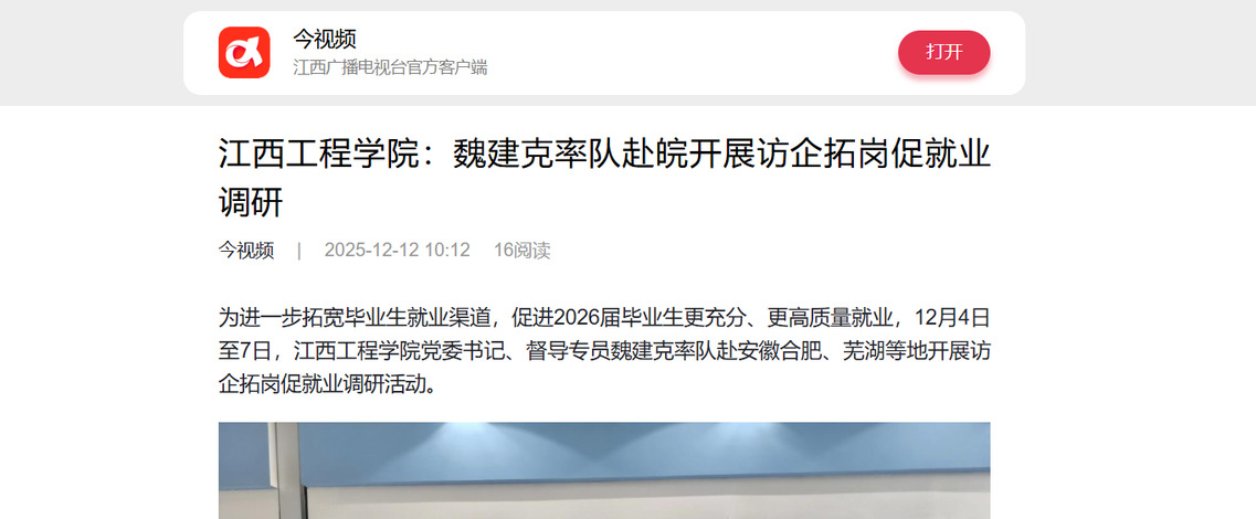 為進(jìn)一步拓寬畢業(yè)生就業(yè)渠道,促進(jìn)2026屆畢業(yè)生更充分、更高質(zhì)量就業(yè),12月4日至7日,江西工程學(xué)院黨委書記、督導(dǎo)專員魏建克率隊赴安徽合肥、蕪湖等地開展訪企拓崗促就業(yè)調(diào)研活動。