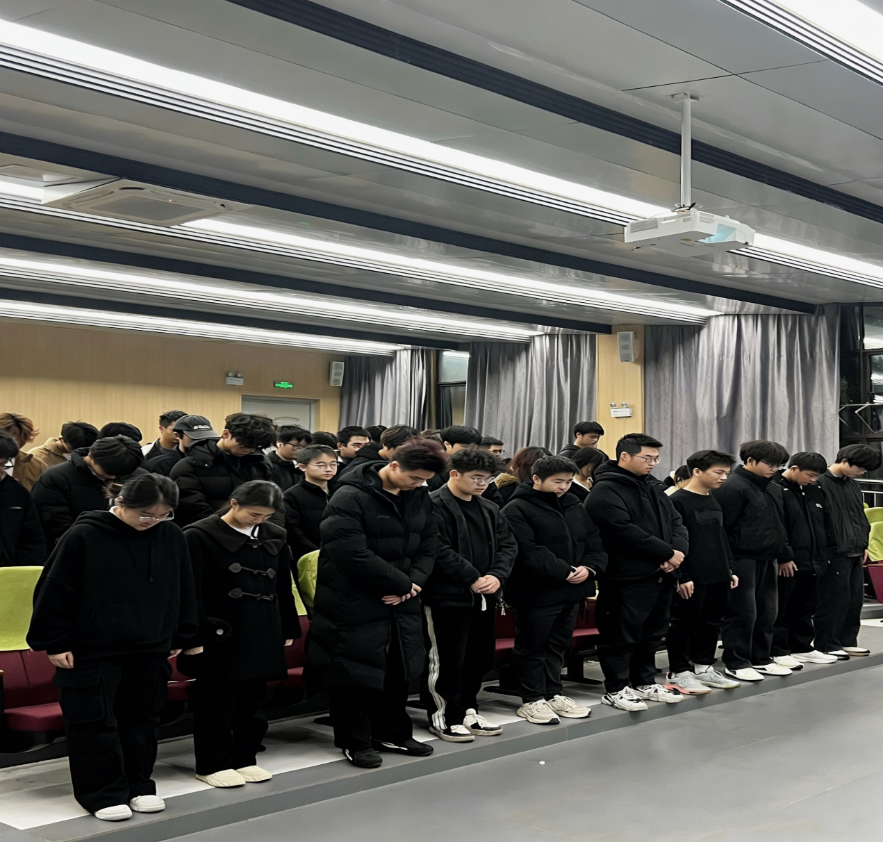 夜幕降臨,校團(tuán)委學(xué)生會(huì)組織學(xué)子們齊聚C208教室,開展國(guó)家公祭日主題觀影活動(dòng)。當(dāng)屏幕上浮現(xiàn)出南京大屠殺遇難同胞的紀(jì)念影像時(shí),同學(xué)們?nèi)w起立,低頭默哀。一分鐘的時(shí)間里,現(xiàn)場(chǎng)寂靜無(wú)聲,唯有沉重的歷史回響在每個(gè)人的心頭。同學(xué)們將對(duì)遇難同胞的深切緬懷、對(duì)和平的無(wú)限向往,都凝聚在這肅穆的一分鐘里,以最莊嚴(yán)的姿態(tài)告慰逝者,更在心底立下“銘記歷史、吾輩自強(qiáng)”的錚錚誓言。