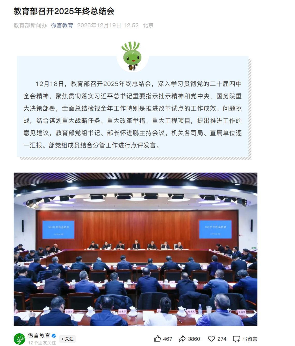 12月18日,教育部召開2025年終總結(jié)會,深入學(xué)習(xí)貫徹黨的二十屆四中全會精神,聚焦貫徹落實(shí)習(xí)近平總書記重要指示批示精神和黨中央、國務(wù)院重大決策部署,全面總結(jié)檢視全年工作特別是推進(jìn)改革試點(diǎn)的工作成效、問題挑戰(zhàn),結(jié)合謀劃重大戰(zhàn)略任務(wù)、重大改革舉措、重大工程項(xiàng)目,提出推進(jìn)工作的意見建議。教育部黨組書記、部長懷進(jìn)鵬主持會議。機(jī)關(guān)各司局、直屬單位逐一匯報(bào)。部黨組成員結(jié)合分管工作進(jìn)行點(diǎn)評發(fā)言。