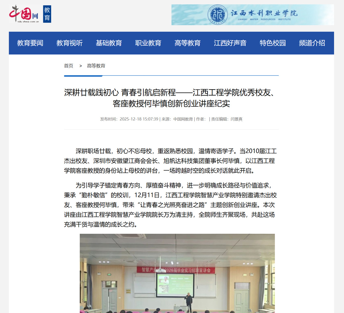 深耕職場(chǎng)廿載,初心不忘母校,重返熟悉校園,溫情寄語學(xué)子。當(dāng)2010屆江工杰出校友、深圳市安徽望江商會(huì)會(huì)長(zhǎng)、旭帆達(dá)科技集團(tuán)董事長(zhǎng)何畢慎,以江西工程學(xué)院客座教授的身份站上母校的講臺(tái),一場(chǎng)跨越時(shí)空的成長(zhǎng)對(duì)話就此開啟。