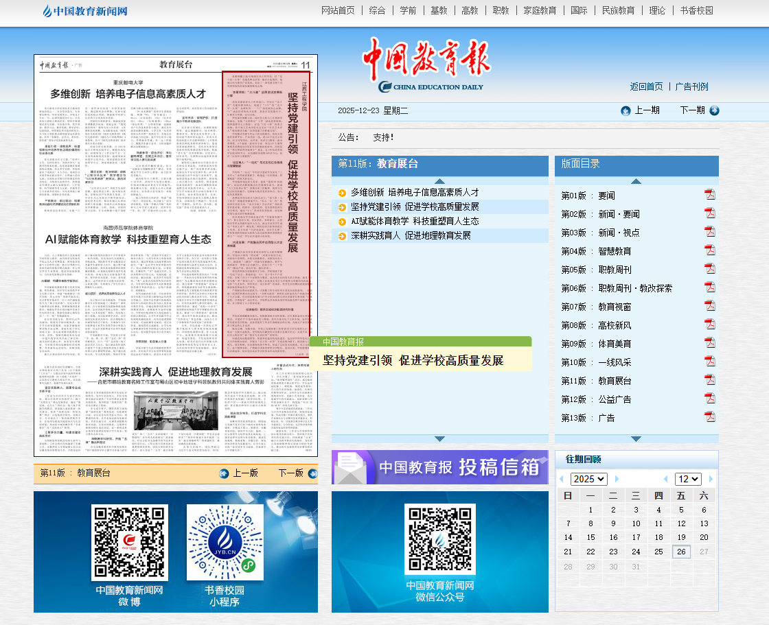 近日,我校以《堅持黨建引領 促進學校高質(zhì)量發(fā)展》為主題的育人實踐成果,在《中國教育報》正式刊發(fā),全面展現(xiàn)學校構建“黨建引領、社區(qū)育人、內(nèi)涵發(fā)展、校地協(xié)同”的“北斗星·紅智”黨建品牌探索路徑與顯著成效,引發(fā)廣泛關注。