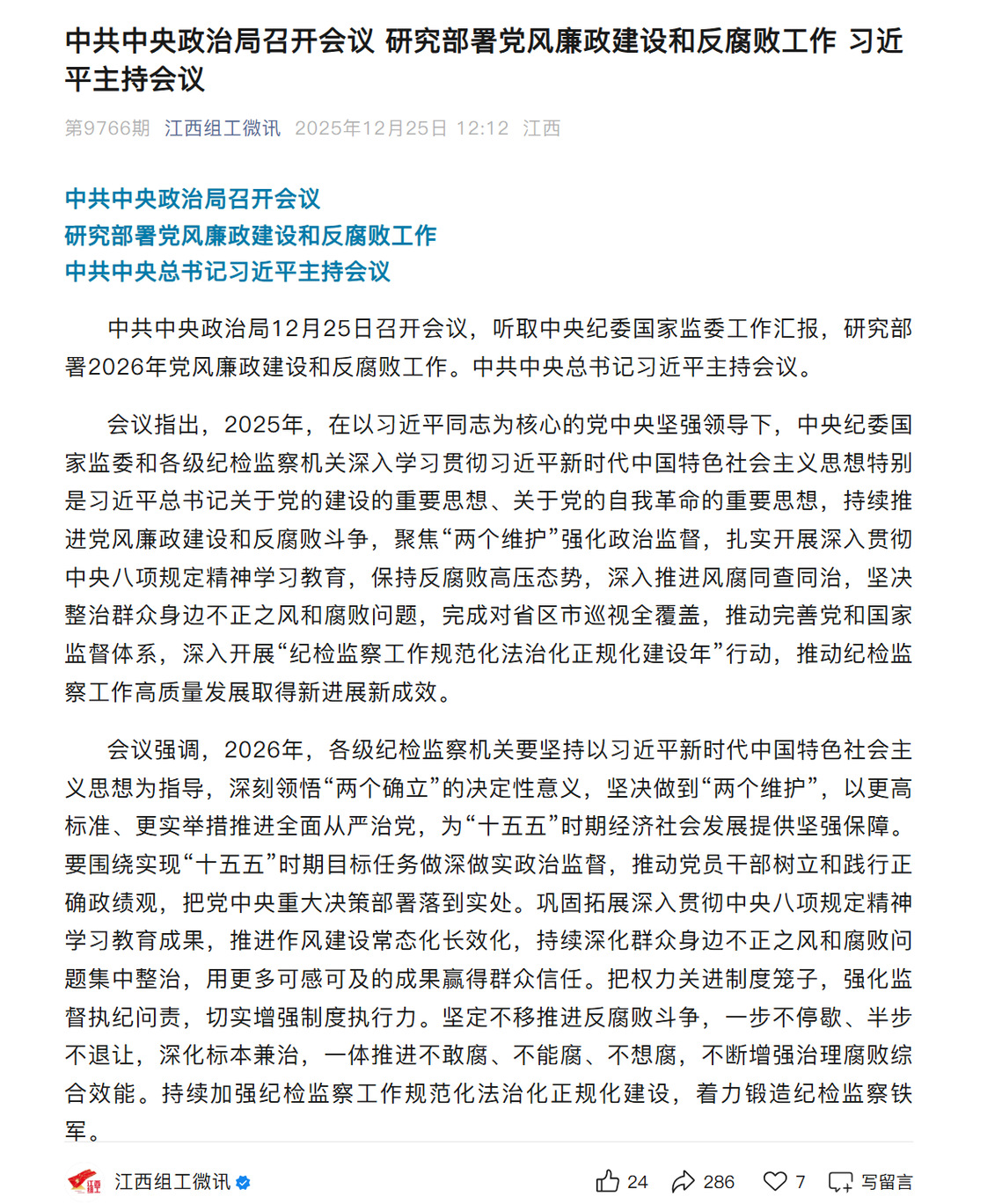 中共中央政治局12月25日召開會(huì)議,聽取中央紀(jì)委國家監(jiān)委工作匯報(bào),研究部署2026年黨風(fēng)廉政建設(shè)和反腐敗工作。中共中央總書記習(xí)近平主持會(huì)議。