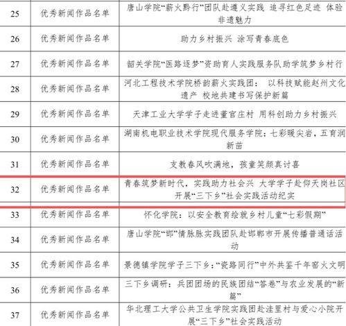 近日,高校思想政治教育與實踐創(chuàng)新研究智庫、新疆大學卓青大思政協(xié)同育人智庫聯(lián)合公布2025年暑期“三下鄉(xiāng)(筑夢鄉(xiāng)行)專欄”評優(yōu)結果,我校團委、馬克思主義學院、學工處聯(lián)合各二級學院組建50余個團隊,憑借優(yōu)質成果榮獲十佳實踐作品1項、優(yōu)秀新聞作品7項、優(yōu)秀視頻作品2項,彰顯了我校學子扎根實踐、擔當作為的青春風采。