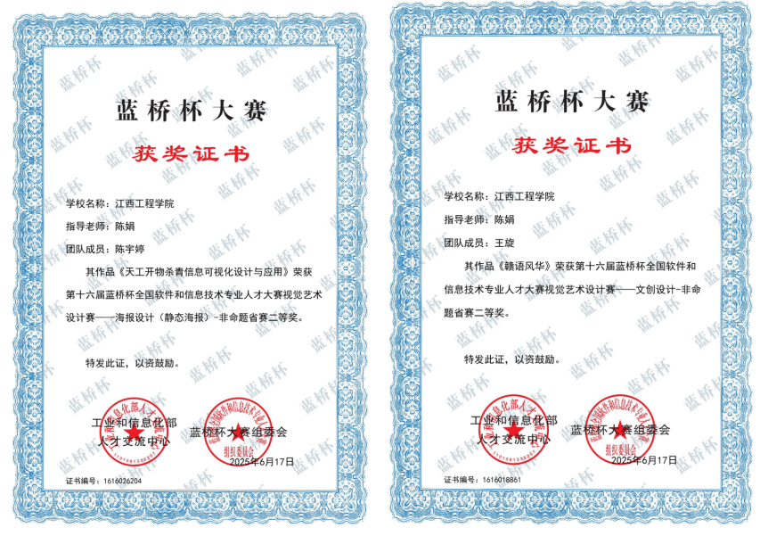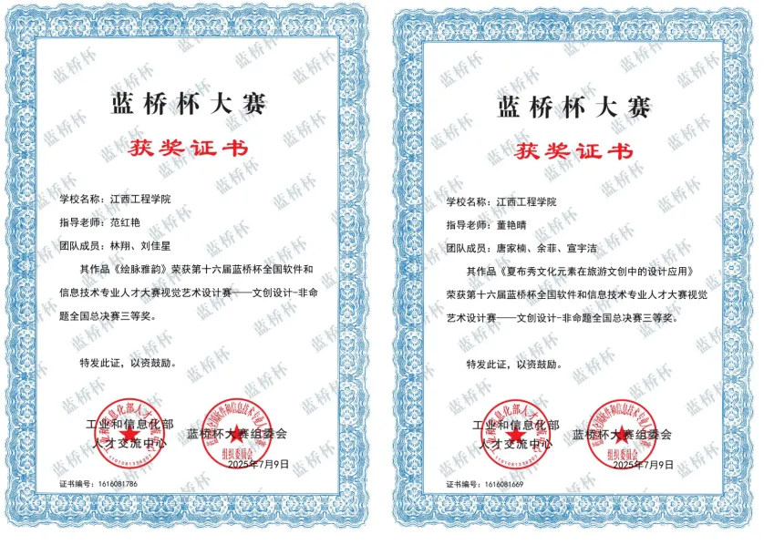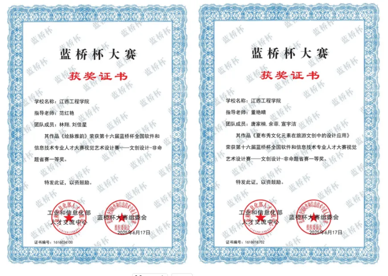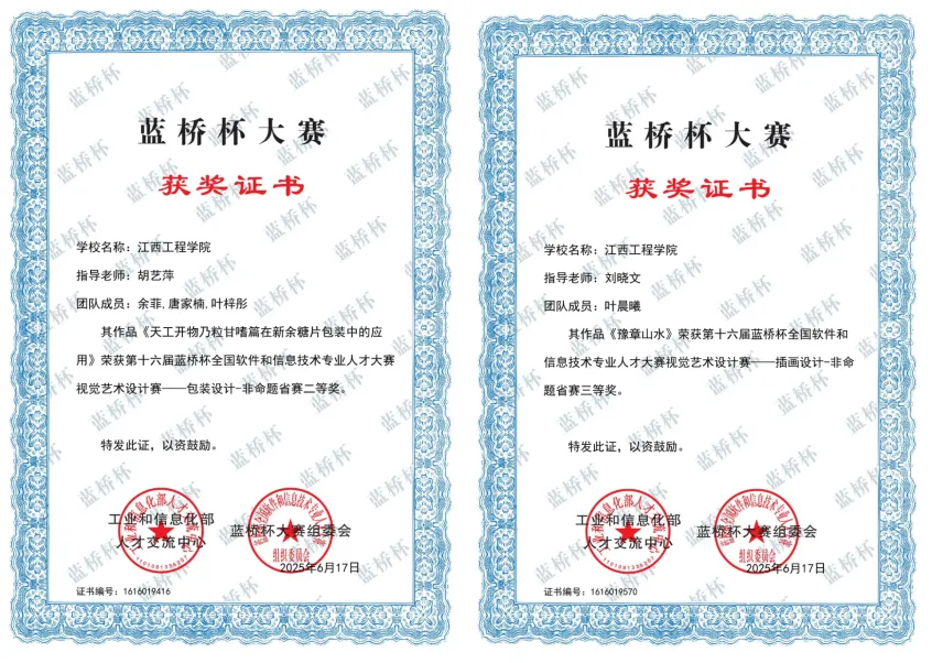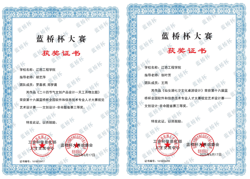 2025第13屆未來設計師·全國高校數(shù)字藝術設計大賽自5月啟動以來,學院高度重視,經(jīng)過校級,省級選拔與決賽的層層篩選,江西工程學院抱石藝術學院程麗瑩、周思穎、杜聿成、余菲菲、林雪梅、王雨欣、鄺麗娜、古文意、向思思、劉愛玲、吳正威、劉林盛、陳洪斌、馬宛玉、張佳藝、傅婷婷、董菲菲、張婉婧、楊爍、李麗云、王旋、粟楨湞、程雨婷、郭名輝、蘆奕、周杰、方雨晴同學榮獲省級一等獎2項,二等獎3項,三等獎11項,蘆奕、周杰、方雨晴同學成功晉級全國總決賽,最終榮獲全國總決賽二等獎。
