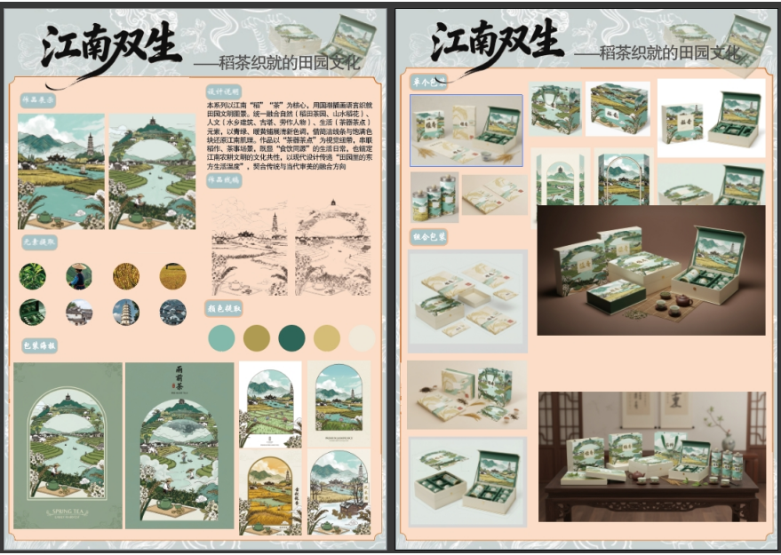 抱石藝術學院視覺傳達設計本科專業(yè)的參賽團隊作品在第十屆兩岸新銳設計競賽“華燦獎”賽事中,斬獲全國三等獎,參賽作品緊扣賽事定向主題“茶韻稻香,食美惟揚”,以茶、稻等傳統(tǒng)飲食文化元素為核心,融合現(xiàn)代設計語言打磨作品。這一成果不僅是對團隊師生專業(yè)能力的直接肯定,更展現(xiàn)了抱石藝術學院設計類專業(yè)“文化賦能+實踐創(chuàng)新”的教學成效與學子的創(chuàng)作實力。