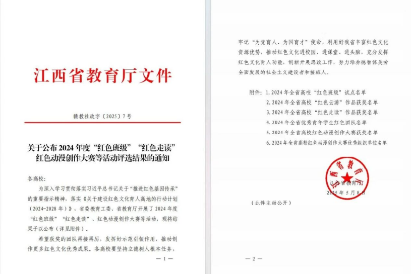 2025年5月,江西省教育廳公布了2024年度“紅色班級”“紅色走讀”紅色動漫創(chuàng)作大賽等活動評選結果的通知。抱石藝術學院《江西紅色走讀:記憶中的烽火歲月》作品獲全省高校二等獎。