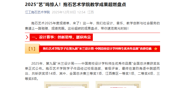 2025年,抱石藝術學院堅持以賽促學、以賽促教,持續(xù)推進“文化賦能+實踐創(chuàng)新”的教學模式,在國家級、省級多項賽事中實現(xiàn)歷史性突破。這些成果既是師生專業(yè)能力的體現(xiàn),也是學院教學質量和育人成效的生動證明。