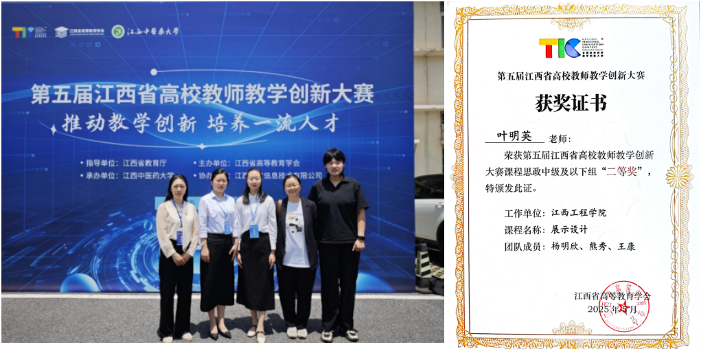 在第五屆江西省高校教師教學創(chuàng)新大賽中,我校環(huán)境設計教研室《展示設計》教學團隊教師憑借教學理念的前沿性、教學設計的系統(tǒng)性與課堂實施的有效性,葉明英老師榮獲第五屆江西省高校教師教學創(chuàng)新大賽課程思政中級及以下組二等獎,體現(xiàn)了在教學改革與創(chuàng)新實踐中的積極探索。
