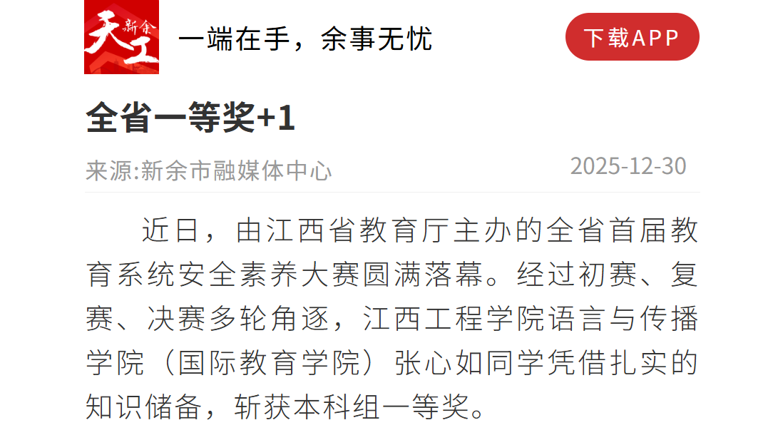 近日,由江西省教育廳主辦的全省首屆教育系統(tǒng)安全素養(yǎng)大賽圓滿落幕。經(jīng)過初賽、復(fù)賽、決賽多輪角逐,江西工程學(xué)院語言與傳播學(xué)院(國際教育學(xué)院)張心如同學(xué)憑借扎實(shí)的知識儲備,斬獲本科組一等獎。