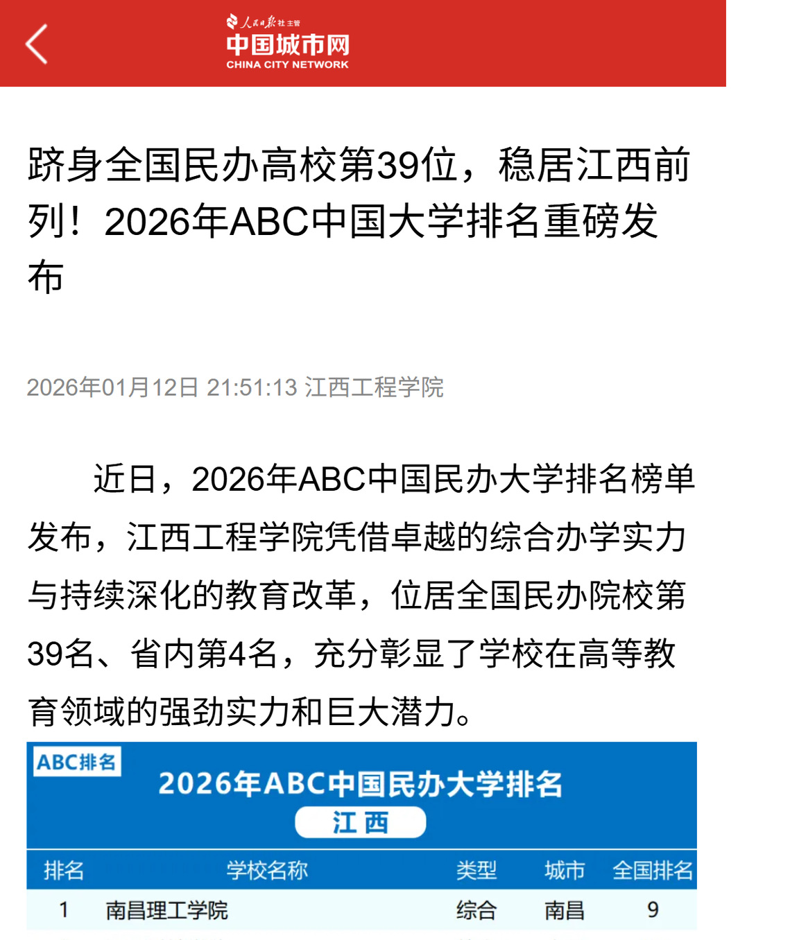 近日,2026年ABC中國民辦大學排名榜單發(fā)布,江西工程學院憑借卓越的綜合辦學實力與持續(xù)深化的教育改革,位居全國民辦院校第39名、省內第4名,充分彰顯了學校在高等教育領域的強勁實力和巨大潛力。