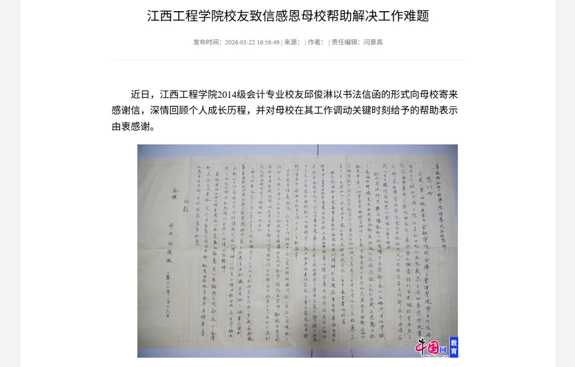 近日,江西工程學(xué)院2014級(jí)會(huì)計(jì)專業(yè)校友邱俊淋以書法信函的形式向母校寄來感謝信,深情回顧個(gè)人成長(zhǎng)歷程,并對(duì)母校在其工作調(diào)動(dòng)關(guān)鍵時(shí)刻給予的幫助表示由衷感謝。