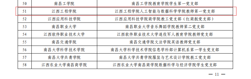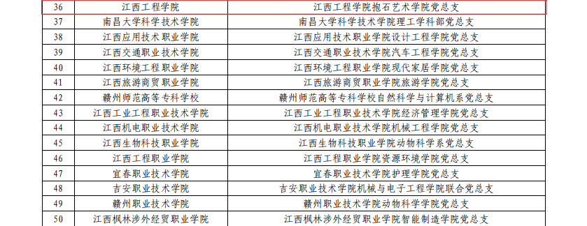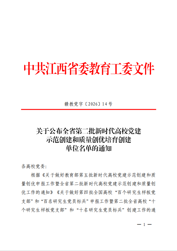 近日,中共江西省委教育工委印發(fā)《關于公布全省第二批新時代高校黨建示范創(chuàng)建和質量創(chuàng)優(yōu)培育創(chuàng)建單位名單的通知》(贛教黨字〔2026〕14號),遴選產生“全省黨建工作標桿院系”50個和“全省黨建工作樣板支部”102個。學校抱石藝術學院黨總支入選“全省黨建工作標桿院系”培育創(chuàng)建單位,人工智能與數據科學學院教師第一黨支部入選“全省黨建工作樣板支部”培育創(chuàng)建單位。這是省委教育工委對學?;鶎狱h建工作的充分認可,也是學校推進黨建與教育教學、專業(yè)建設深度融合的重要成果,體現了學?;鶎狱h組織建設的扎實基礎與鮮明特色。