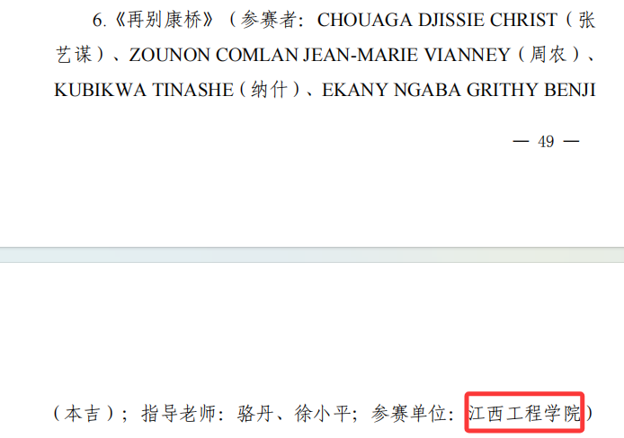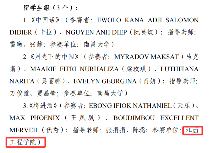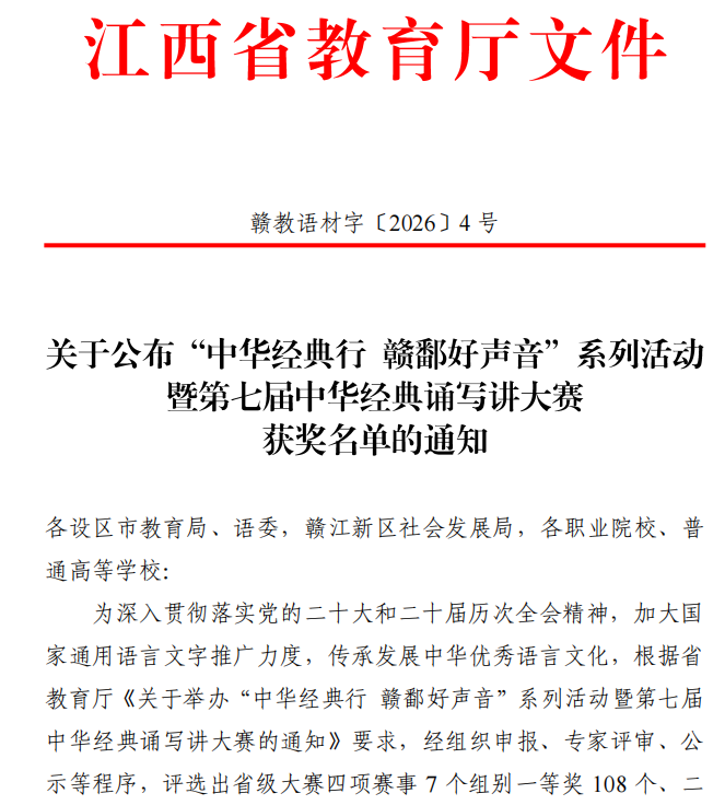 近日,省教育廳正式公布“中華經(jīng)典行 贛鄱好聲音”系列活動(dòng)暨第七屆中華經(jīng)典誦寫講大賽獲獎(jiǎng)名單,江西工程學(xué)院選送的留學(xué)生作品《將進(jìn)酒》《再別康橋》分別榮獲誦讀大賽留學(xué)生組一等獎(jiǎng)和三等獎(jiǎng),展現(xiàn)了學(xué)校在留學(xué)生中華經(jīng)典文化教育方面的豐碩成果。