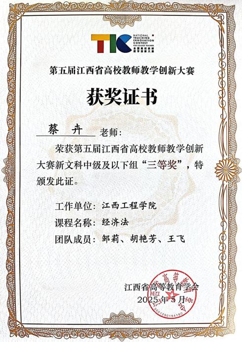 [11]第五屆江西省教學創(chuàng)新大賽獲新文科賽道講師及以下組三等獎,2025年5月;